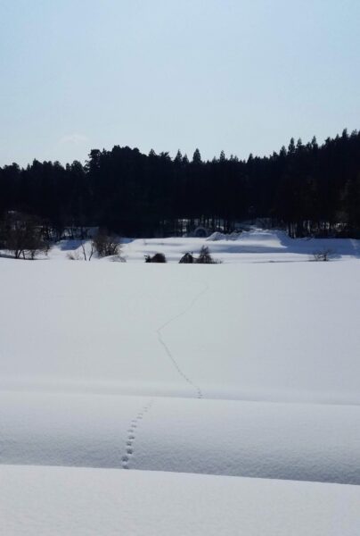 今朝の写真は未踏の雪原を歩く快感をお裾分け、カンジキ散歩のワンカット。